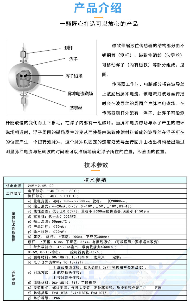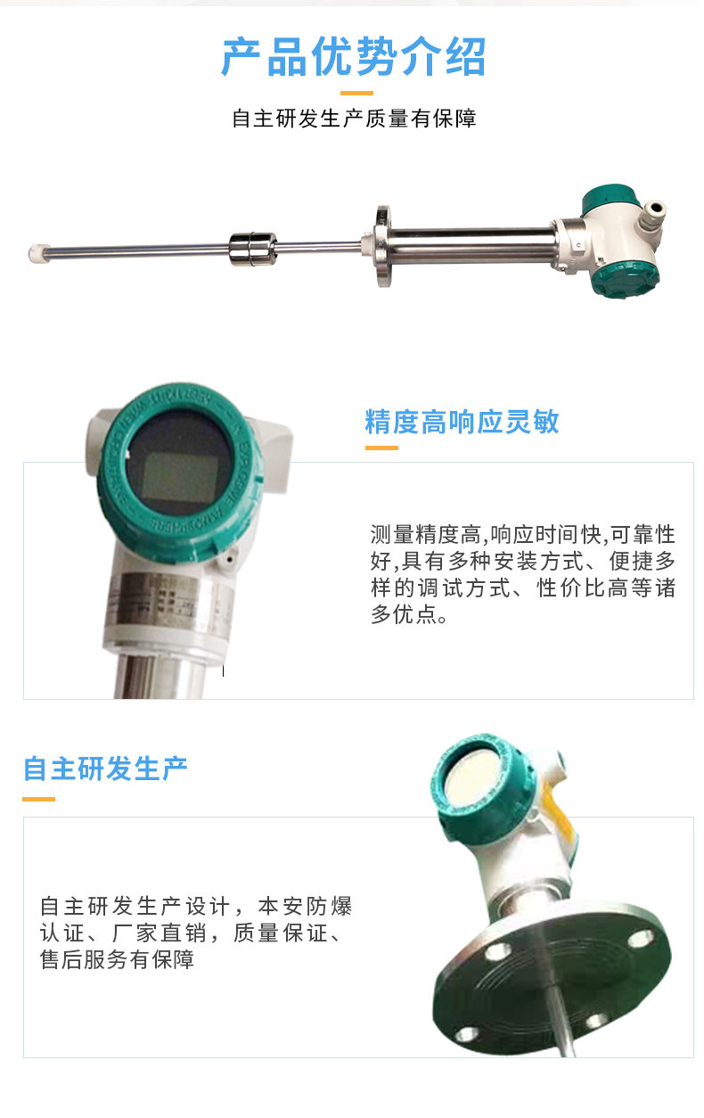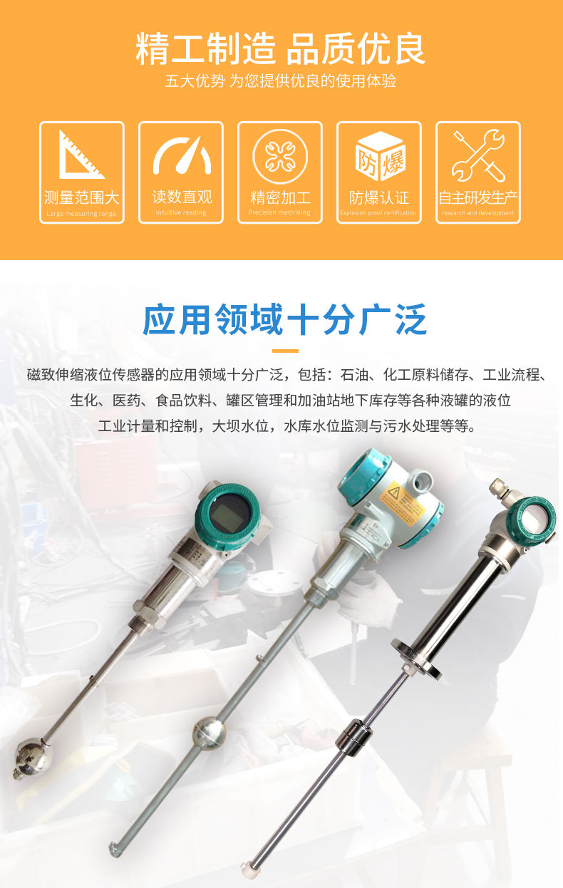 1.可靠性強(qiáng):由于磁致伸縮液位計(jì)采用波導(dǎo)原理,無機(jī)械可動(dòng)部分,故無摩擦,無磨損。整個(gè)變換器封閉在不銹鋼管內(nèi),和測(cè)量介質(zhì)非接觸,傳感器工作可靠,壽命長(zhǎng)。