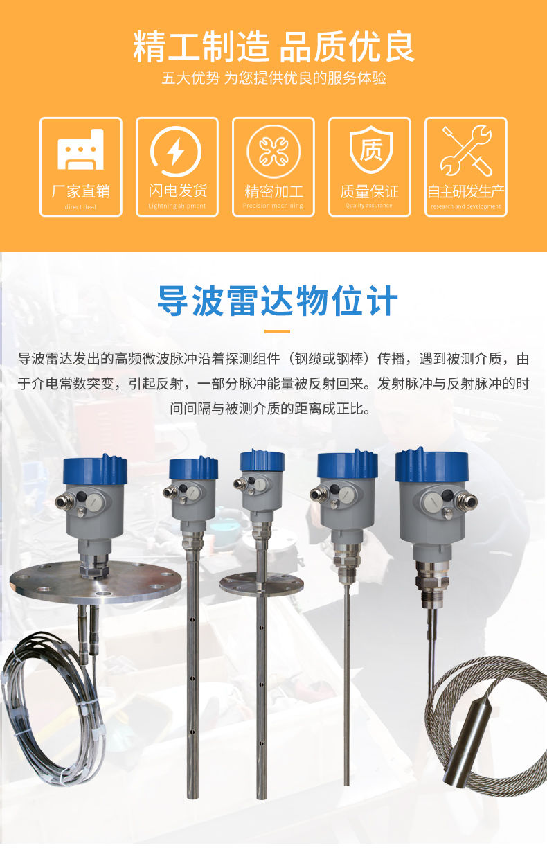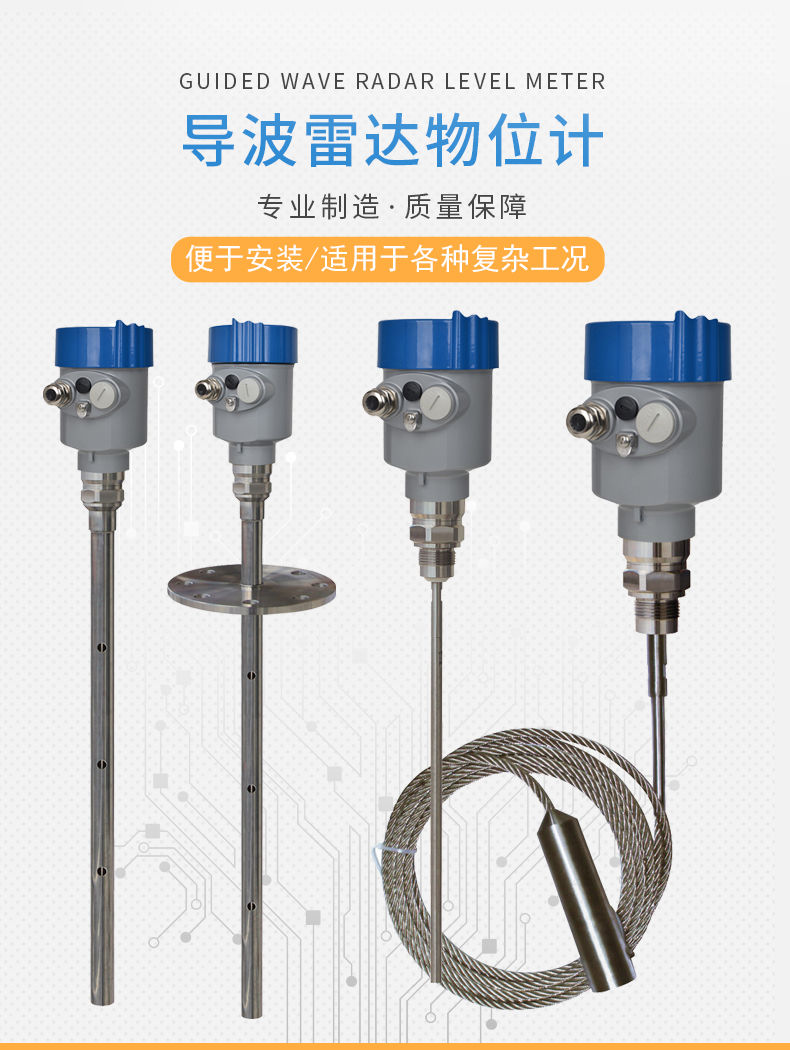 采用脈沖工作方式,導(dǎo)波雷達(dá)物位計發(fā)射功率極低,可安裝于各種金屬、非金屬容器,對人體及環(huán)境均無傷害。