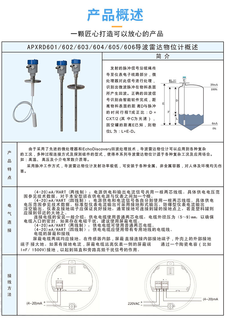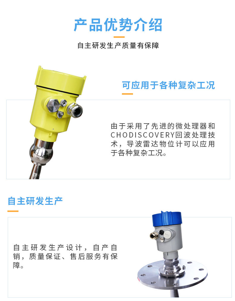 由于采用了先進(jìn)的微處理器和獨(dú)特的EchoDiscovery回波處理技術(shù),導(dǎo)波雷達(dá)物位計可以應(yīng)用到各種復(fù)雜的工況,多種過程連接方式及探測組件的型式,使得本系列導(dǎo)波雷達(dá)物位計適于各種復(fù)雜工況及應(yīng)用場合。如:高溫、 高壓及小介電常數(shù)介質(zhì)等。