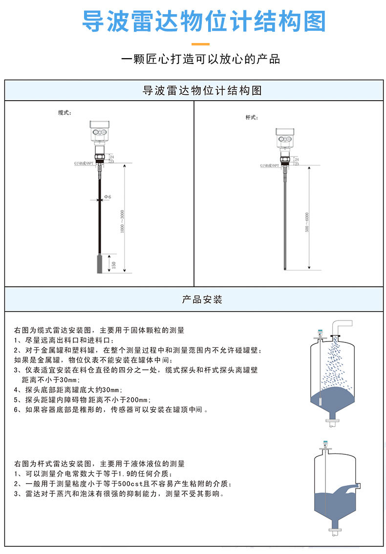 3、儀表適宜安裝在料倉直徑的四分之一處,纜式探頭和桿式探頭離罐壁最小距離不小于30mm;