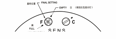 A).對于一個沒有水的空容器,調節(jié)細(F)靈敏度控制到中間位置,然后慢慢調節(jié)粗(C)靈敏度直到狀態(tài)指示燈剛剛變紅。重調細(F)靈敏度控制線找到一個剛剛變紅點,記下“空”的位置。然后,將探頭插入物料重調細(F)靈敏度控制(不接觸粗調靈敏度)剛好變?yōu)榫G點,并記下它的位置。注意兩個記號的不同,并且重調細(F)靈敏度控制到兩個記號的中間位置。這就是一個完整的調試過程。對于非水基工藝液體(不導電液體)最好的安裝方法是垂直安裝,當液體到達一半時報警。