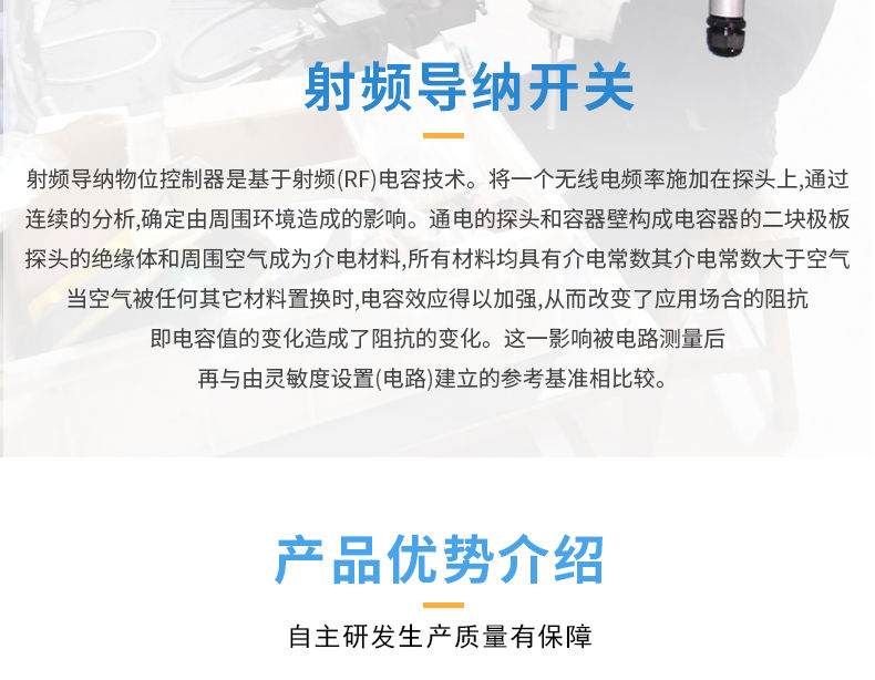 射頻導(dǎo)納開關(guān)是一種高智能料位測量產(chǎn)品,它克服了以往測量方式的報警精度低和調(diào)校步驟復(fù)雜給客戶帶來的不便,該液位開關(guān)廣泛應(yīng)用于,化工冶金石油機械食品電廠出廠食料等行業(yè)。