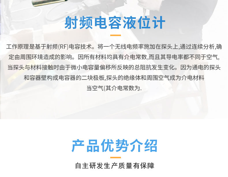 電容液位計(jì)電子線路采用了抗粘附電路,可以在探測(cè)真實(shí)物的同時(shí),清除粘附和懸掛在探頭周?chē)募傥镂恍盘?hào)影響。工作原理是基于射頻(R F)電容技術(shù)。將一個(gè)無(wú)線電頻率施加在探頭上,通過(guò)連續(xù)分析,確定由周?chē)h(huán)境造成的影響。因所有材料均具有介電常數(shù), 而且其導(dǎo)電率都不同于空氣,當(dāng)探頭與材料接觸時(shí)由于微小電容量偏移所反映的總阻抗發(fā)生變化。因?yàn)橥姷奶筋^和容器壁構(gòu)成電容器的二塊極板,探頭的絕緣體和周?chē)諝獬蔀榻殡姴牧希?當(dāng)空氣( 其介電常數(shù)為1 . 0) 被任何其它材料( 介電常數(shù)> 1)置換時(shí),電容值的變化造成了阻抗的變化。這一影響被電路測(cè)量后,再與由靈敏度設(shè)備設(shè)置(電路)建立的參考基準(zhǔn)相比較。