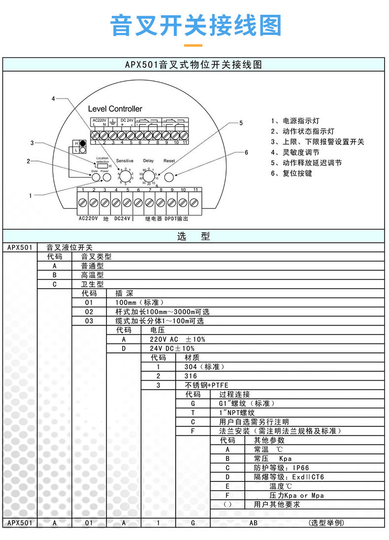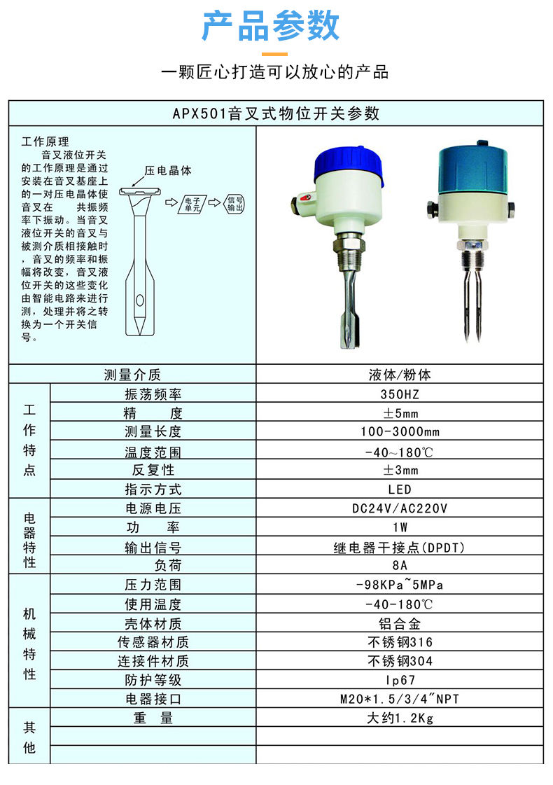 ?該產(chǎn)品可以對料罐的高低位進(jìn)行檢測、控制和報警,適用于各種液體、粉末、顆粒狀固體。它實用簡單、運行可靠、適用性強(qiáng)基本上是免維護(hù)的、音叉和輸出均有工作狀態(tài),均用發(fā)光二極管指示,可依據(jù)習(xí)慣調(diào)整狀態(tài)指示,并配有三種輸入方式(直流24V、交流110V和交流220V)和多種輸出方式(直流電流輸出型、繼電器接點輸出型、直流電壓輸出型)。所有類型均有高或低故障報警模式和可選擇的儀表開關(guān)靈敏度。